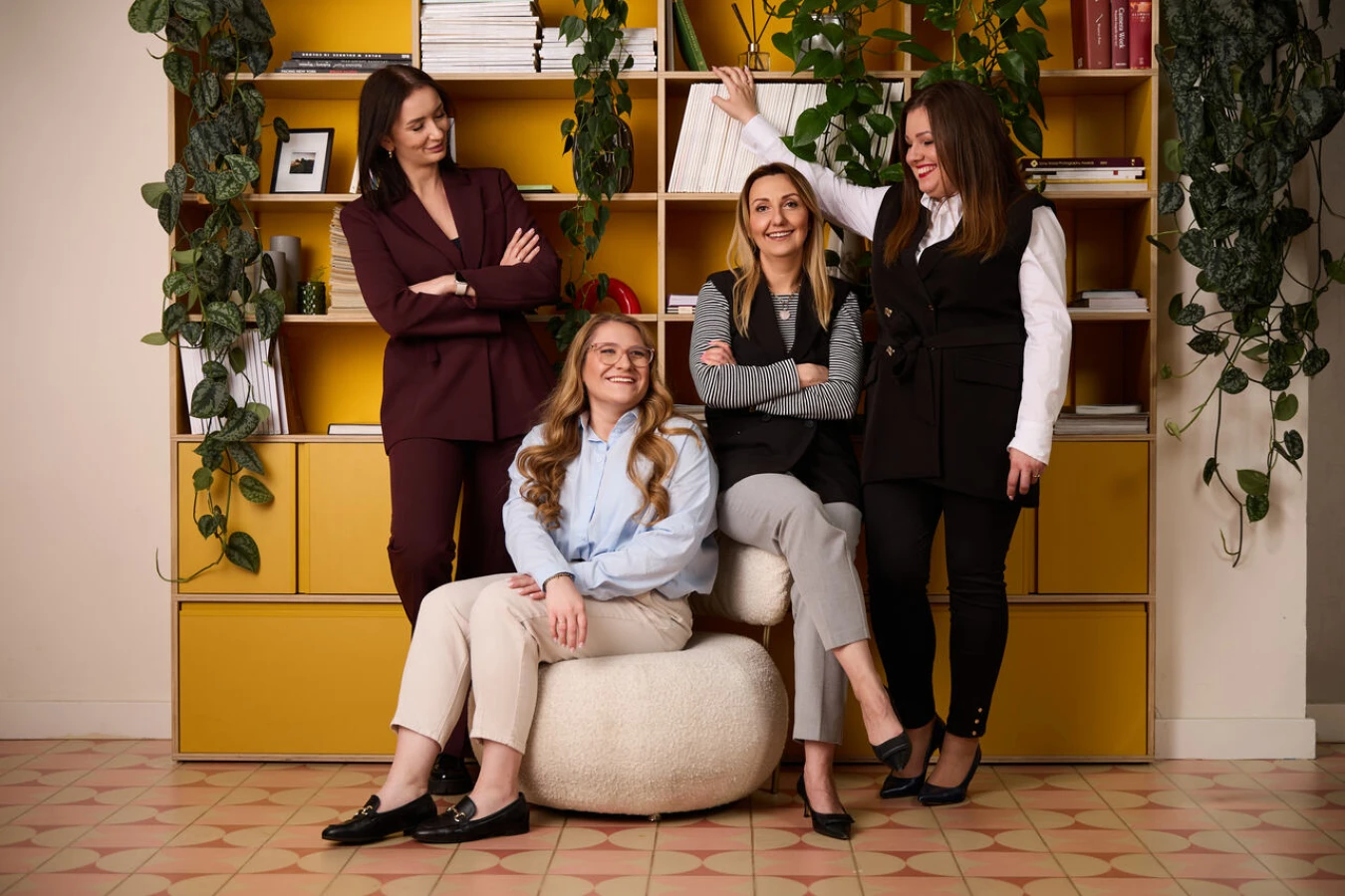 Na zdjęciach dużą rolę odgrywa mowa ciała – bliskość, swobodne ułożenie rąk, lekkie oparcie o siebie czy naturalne uśmiechy pokazują komfort i dobrą energię w zespole. Kadry grupowe zostały zaplanowane tak, aby podkreślić relacje, a nie hierarchię – osoby stoją i siedzą blisko siebie, tworząc spójne, partnerskie kompozycje. Ciepłe, miękkie światło oraz przyjazne, nowoczesne wnętrza z elementami drewna, roślin i stonowanych kolorów budują atmosferę dostępności i równowagi. Tło nie dominuje nad bohaterami, ale subtelnie wzmacnia przekaz, tworząc środowisko, w którym ludzie są w centrum uwagi.